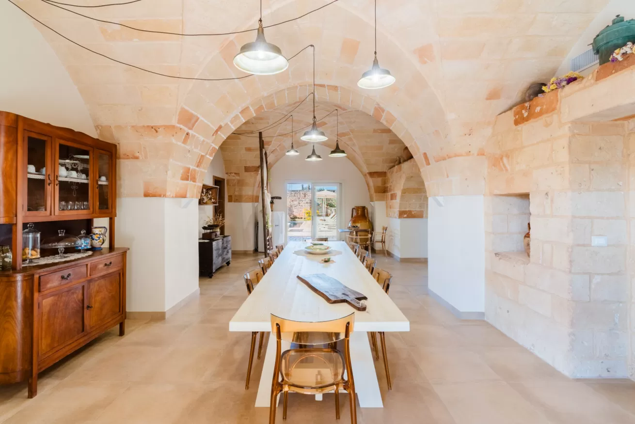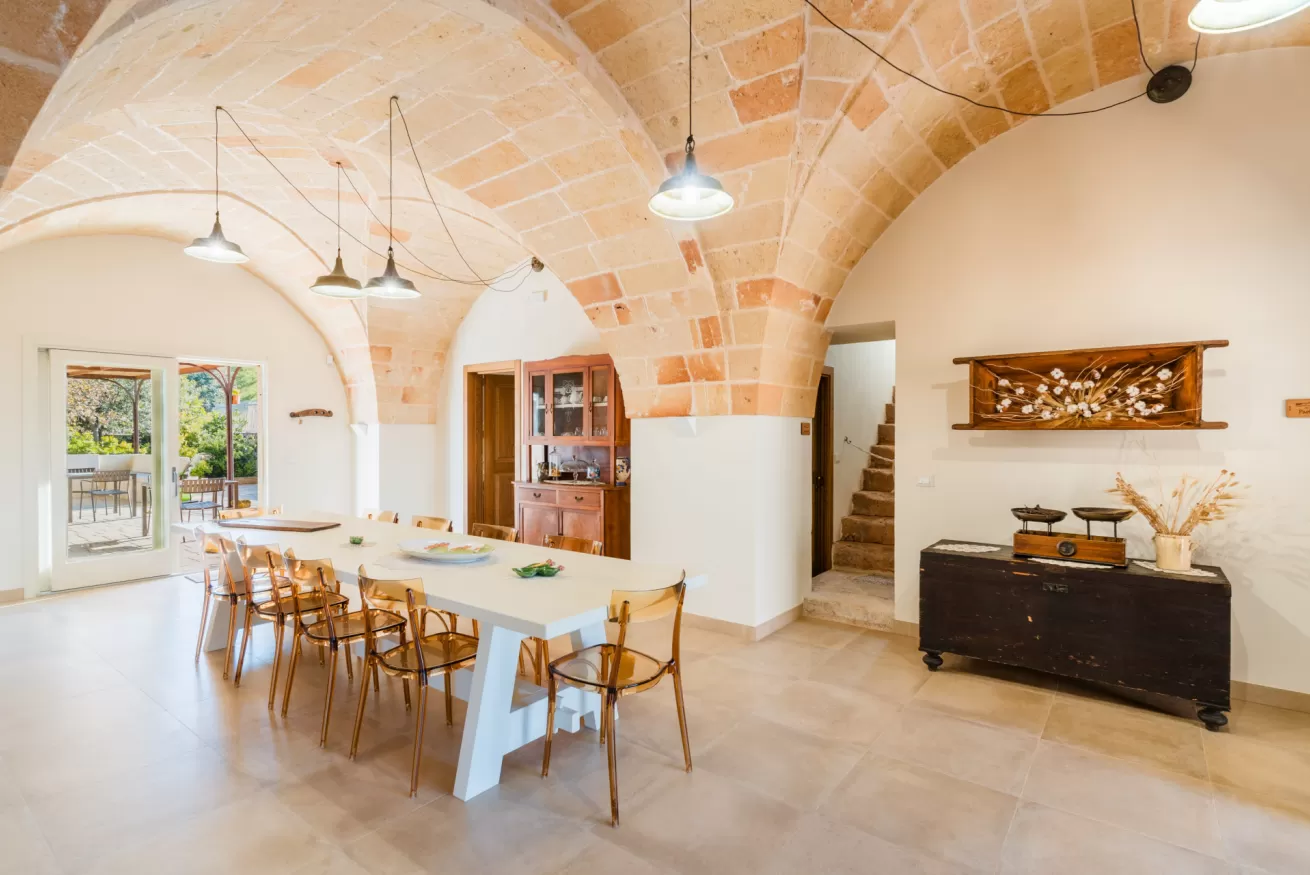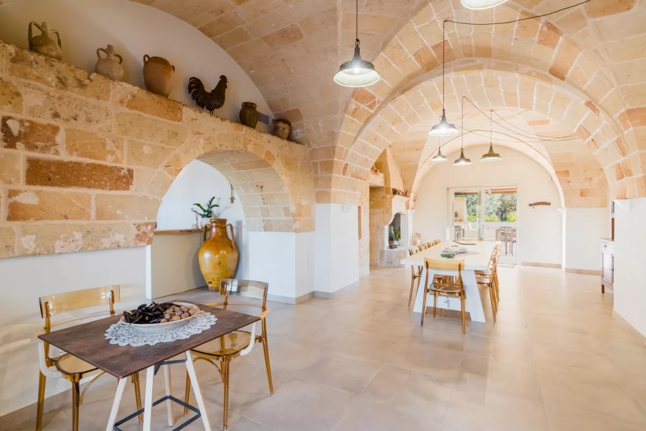 Gli ambienti riflettono lo stile autentico della masseria, con materiali naturali, colori caldi e un’atmosfera rilassante.