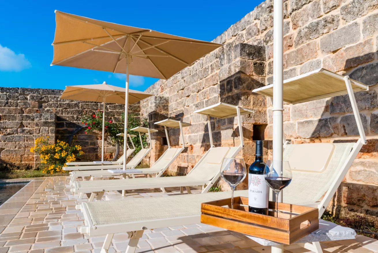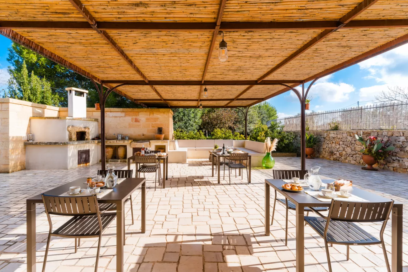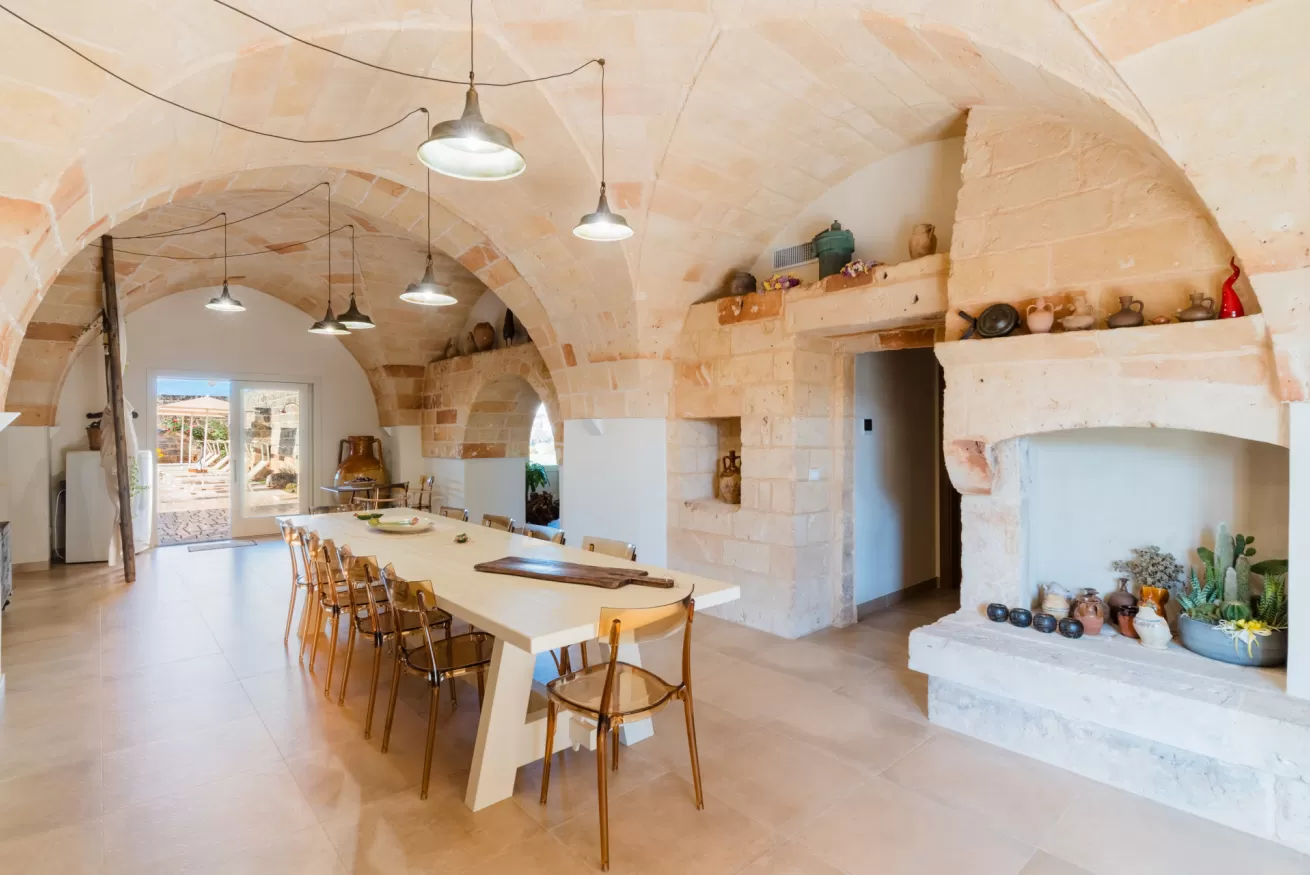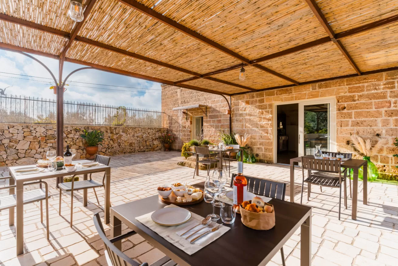Gli ambienti riflettono lo stile autentico della masseria, con materiali naturali, colori caldi e un’atmosfera rilassante.