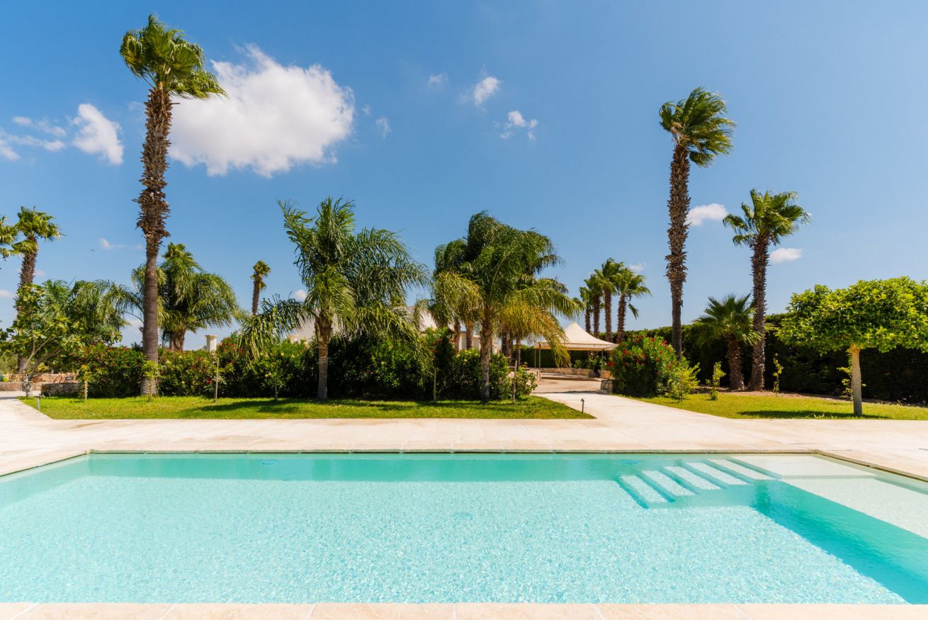 🏊♂️ All'interno della villa è presente un’ampia piscina privata circondata da palme e da un giardino curato sarà a vostra esclusiva disposizione per tutta la durata del soggiorno.