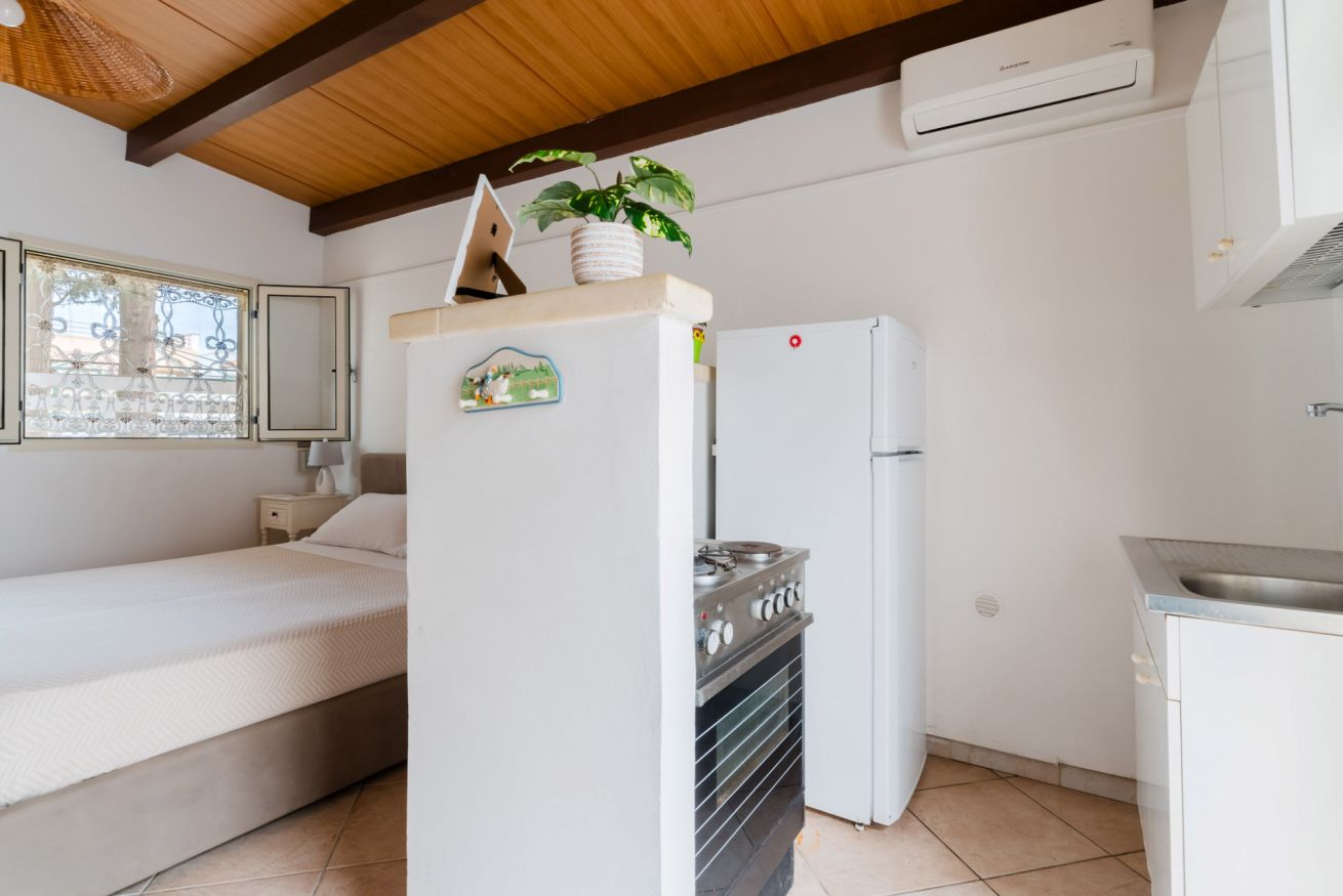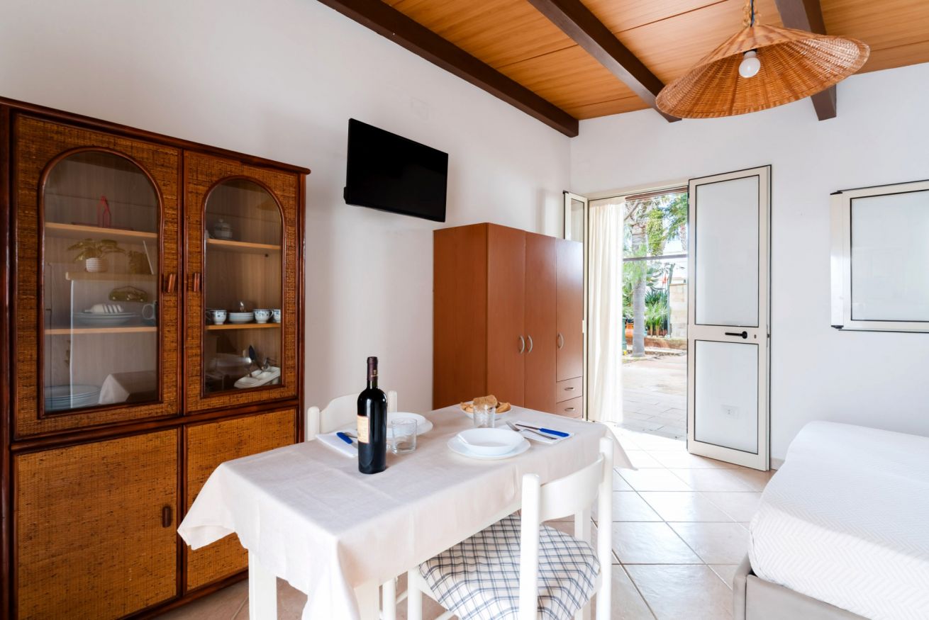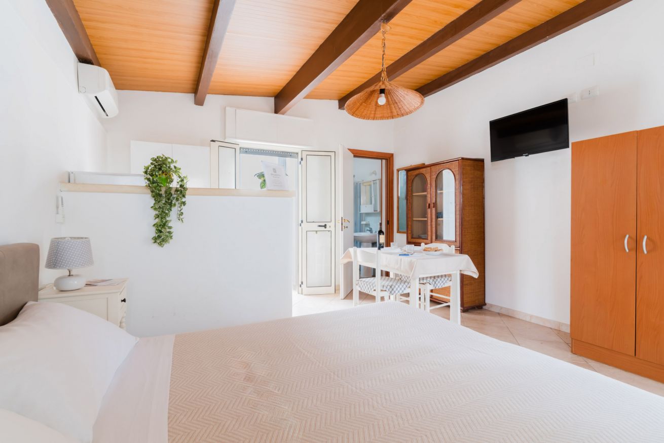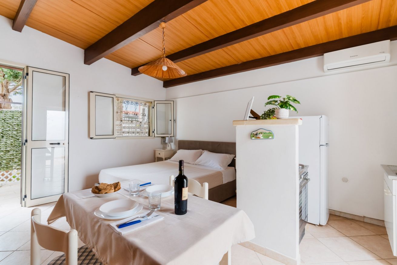 Lo spazio è composto da angolo cottura, bagno con doccia, letto matrimoniale e zona esterna in comune.