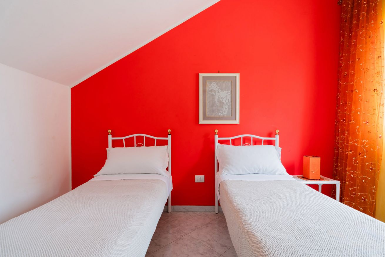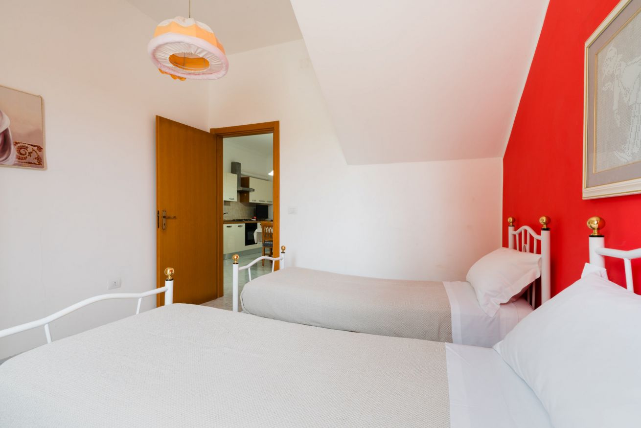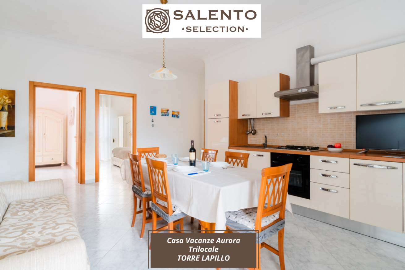 Casa Vacanze Aurora Trilocale al piano terra troviamo un grande appartamento con ampia zona pranzo, cucina attrezzata, due camere da letto formate un matrimoniale e due singoli, ampia veranda, circondati dal verde, per un totale di 4 posti.